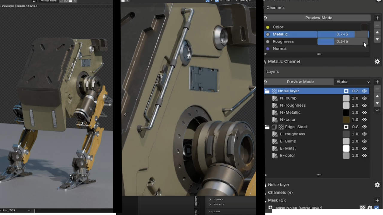 - အထူးသဖြင့် ခုလိုမျိုး စက်ရုပ် Model မျိုးတွေမှာ UV မလိုပဲ Texture အလွယ်တကူဖန်တီးလို့ရပါတယ်။